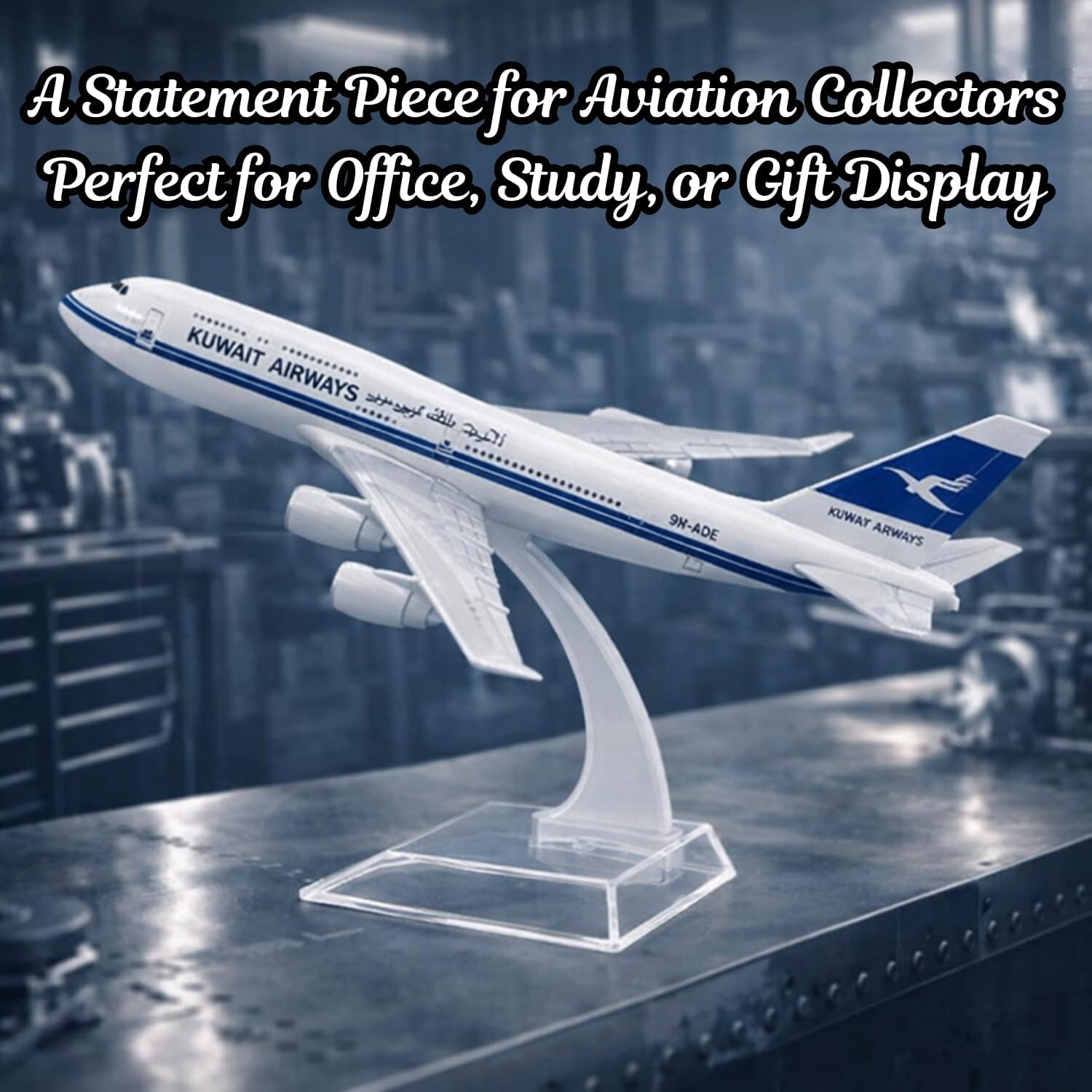 Bring home the grandeur of international aviation with the Kuwait Airways B747 1 : 300 Metal Die-Cast Aircraft Model — a finely crafted miniature that captures the beauty and innovation of modern flight. At 16 cm in length, this compact yet detailed airliner offers an ideal blend of elegance, authenticity and practicality for collectors, aviation professionals and decor enthusiasts alike.Crafted with Precision & Purpose:The B747 model is constructed from die-cast metal and reinforced ABS components to achieve both strength and refinement. Each section — the cockpit, wings, tail and engine pods — is carefully shaped to mirror the graceful architecture of the real aircraft. Its smooth finish and accurate paintwork highlight the Srilankan Airline color scheme and signature tail logo, creating a miniature that is both realistic and visually appealing.The metal composition ensures durability while maintaining a balanced weight that feels solid in hand and stable on display. It resists chipping and fading, allowing it to retain its shine and polish for years, even with regular use or movement.Elegant Acrylic Stand:Each model comes with a transparent acrylic display stand that holds the aircraft in a flight-takeoff position. The crystal-clear base adds sophistication while focusing attention on the plane itself. The stand is lightweight, easy to assemble and can be detached for storage or transport. When placed on a desk or shelf, it creates a captivating “in-motion” display effect that adds life to any space.A Perfect Gift for Aviation Fans:Whether you’re celebrating a special occasion or simply want to inspire someone who loves flying, this B747 metal model makes an excellent gift. It’s ideal for pilots, students, travel agents and frequent flyers who cherish air travel and aircraft design. Its sleek look and symbolic value make it a conversation starter in both professional and personal spaces.Educational & Inspirational Value:Beyond being a display item, this model is an effective visual aid for explaining aerodynamics, airplane components and mechanics. It encourages interest in aviation and STEM subjects among young learners. The B747 miniature reminds its owner of progress, discipline and innovation — qualities at the heart of modern engineering and air travel.Compact Design & Display Versatility:At 16 cm in length, this airplane model offers a perfect balance between detail and portability. It fits effortlessly on office tables, glass showcases or bedroom shelves without taking excess space. Its metallic paint reflects light beautifully, and the clear stand gives the appearance of flight — making it a charming addition to any decorative arrangement.Why Choose This B747 Model:– Die-cast metal construction with precise engraved details.– 1 : 300 scale for realistic proportions and visual impact.– Clear acrylic stand for a professional, in-flight display look.– Compact and lightweight for easy placement and storage.– Suitable for education, decoration and collection.– A symbol of flight, freedom and global connection.Conclusion:Celebrate the spirit of innovation and global travel with the Kuwait Airways B747 16 cm Metal Model. Its refined craftsmanship, durable structure and realistic finish make it more than just a toy — it’s a tribute to modern aviation and the passion for flight. Whether you display it at home, gift it to an aviation enthusiast or use it as an educational piece, this model brings a touch of wanderlust and engineering marvel to your world.