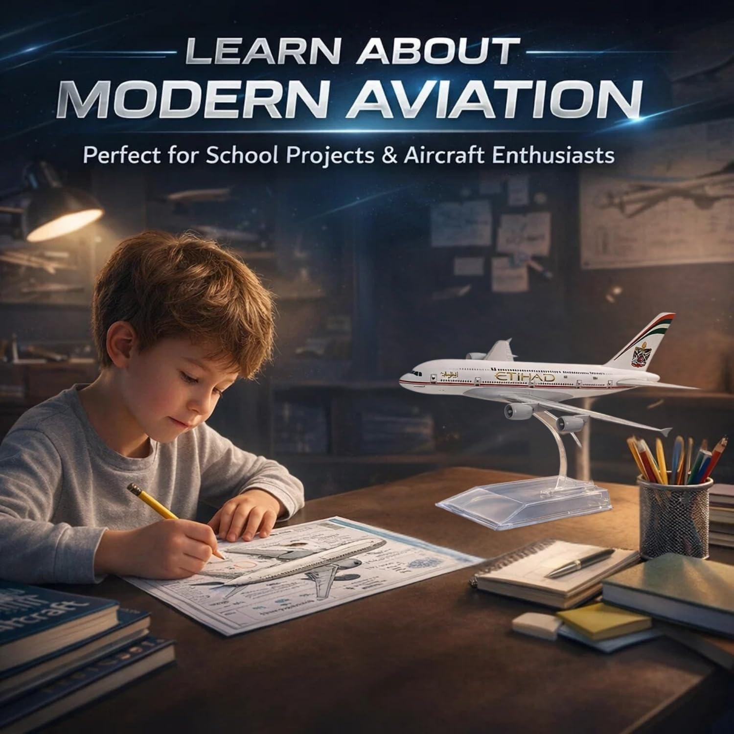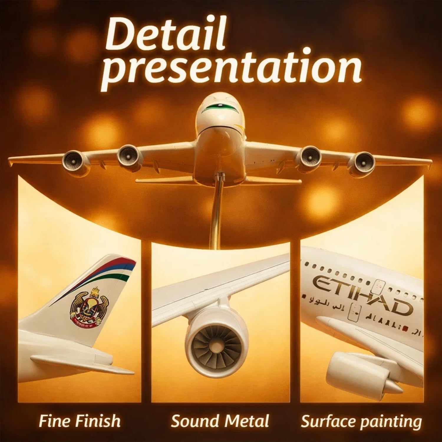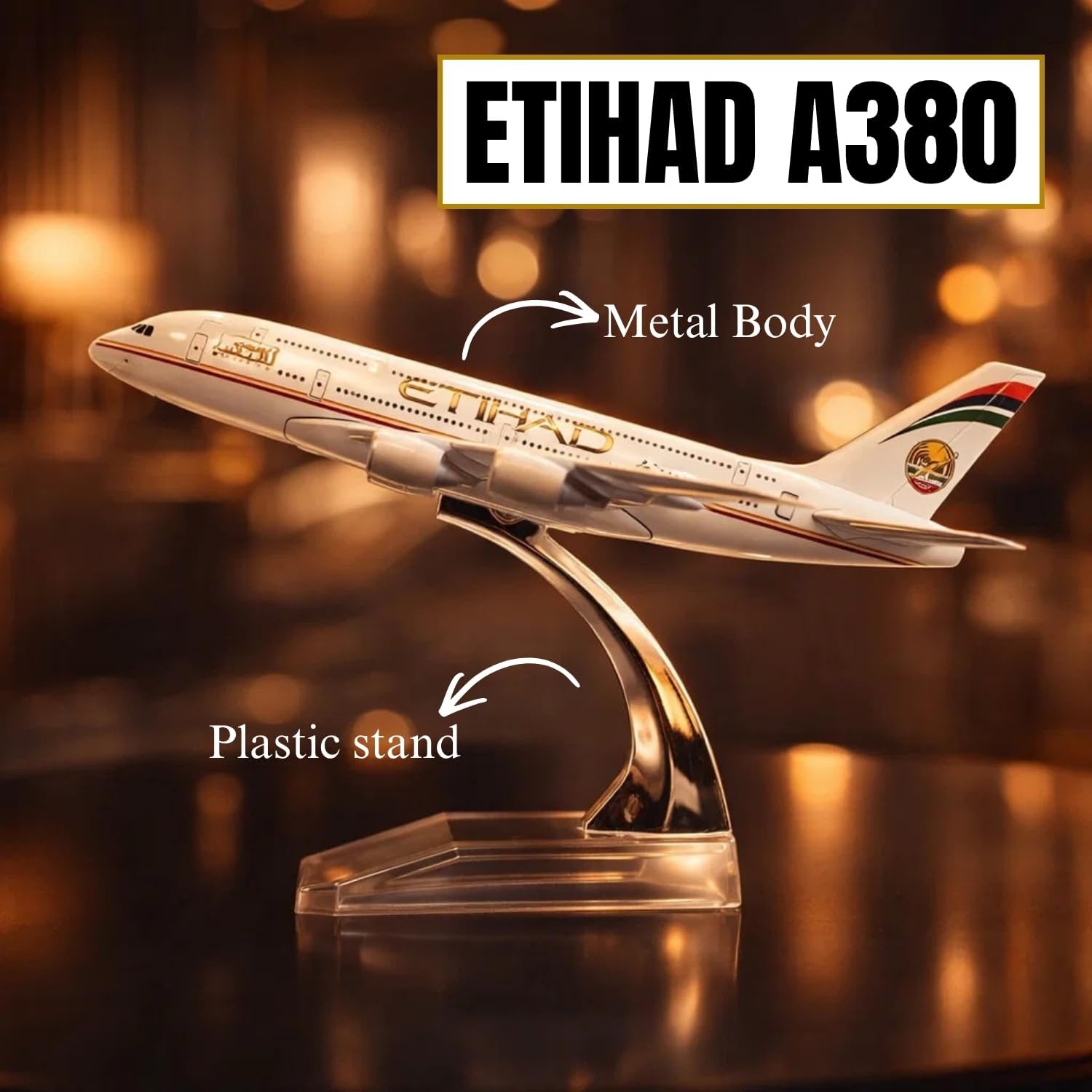 Celebrate your love for aviation with the elegant Etihad A380 1:300 Metal Aircraft Model. Designed with remarkable attention to detail, this 16cm die-cast airplane captures the style and sophistication of one of the world’s most luxurious airliners. Whether you’re a traveler, pilot, or aviation admirer, this model adds inspiration and elegance to your desk or shelf.Durable Metal Build & Realistic Detailing:This Etihad airplane model is made from quality die-cast metal with strong ABS plastic parts, giving it a durable yet refined structure. The surface showcases accurate paintwork, detailed windows, and precise tail graphics that reflect the Etihad brand’s luxurious aesthetic. The sturdy body ensures long-lasting performance without bending or fading, making it ideal for collectors and decorators alike.Elegant Acrylic Display Stand:The model comes with a transparent acrylic stand designed to display the aircraft in flight. Its stable base supports the airplane securely, while the upward tilt gives it a lifelike in-air effect. The stand also helps highlight the Etihad livery and aerodynamic structure, creating a professional look for any space.Perfect Gift for Aviation Fans:Whether you’re gifting it to a friend, pilot, or student, this Etihad A380 aircraft model makes a thoughtful present. It symbolizes ambition, innovation, and the beauty of modern aviation. Suitable for birthdays, holidays, corporate gifts, and special occasions, this collectible will be cherished by anyone fascinated by aircraft and world travel.Educational & Inspirational Value:This A380 model isn’t just decorative—it’s also educational. Kids can learn about airplane design, aerodynamics, and international travel through hands-on interaction. For adults, it serves as a constant reminder of ambition and the limitless possibilities of flight.Compact & Elegant for Any Display:At just 16cm in length, this Etihad A380 model fits beautifully into small or large display spaces. It complements both professional and personal interiors — from office desks to bookshelves, from study rooms to travel agency counters. The metallic finish and precise markings ensure it stands out as an elegant conversation piece.Why Choose This Etihad A380 Model?Compact 16cm model ideal for homes or offices.Made from strong die-cast metal and ABS plastic.Clear acrylic stand for realistic display.Beautiful Etihad design with authentic markings.Suitable for collectors, kids, travelers, and professionals.Conclusion:Bring the spirit of modern aviation to your home or workspace with this beautifully detailed Etihad A380 aircraft model. Its refined design, sturdy build, and elegant stand make it the perfect collectible for enthusiasts of all ages. Whether you’re reliving your flying memories or adding a touch of class to your décor, this model represents the excellence, innovation, and inspiration of the skies.