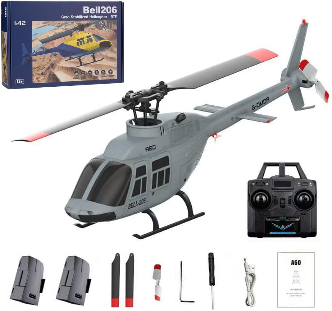 A60 1/42 Scale 206 90-Class RC Helicopter 1/42, A60 206 Remote Control Helicopter for Adults Outdoor, Remote Control Aircraft RC Army Helicopter Model Remote Control Aircraft Birthday Gift Christmas Gift for Adults (RTF Version)Specifications:.Name: 4CH Flybarless Scale RC Helicopter.Item No.: A60.Material: PA/PC.Rotor Diamter: 227mm.Helicopter Weight: 52g.Body Battery: 3.7v Battery.Remote Distance: 80-100meters.Remote Time: 10minutes.Charging Time: 50minutes.Product Weight: 300g.Package Weight: 700g.Product Dimensions: 23.8 x 5.3 x 8.3cm.Package Dimensions: 33 x 22 x 9cm.Packing: Graphic Carton.Age:16+ Product including:.Graphic Carton *1.Helicopter *1.Transmitter *1.Instruction Manual *1.USB Charger *1.Main Propeller Blades *2.Tail Propeller Blade *1.Battery *1.Screwdriver *1.Hexagonal Wrench *1