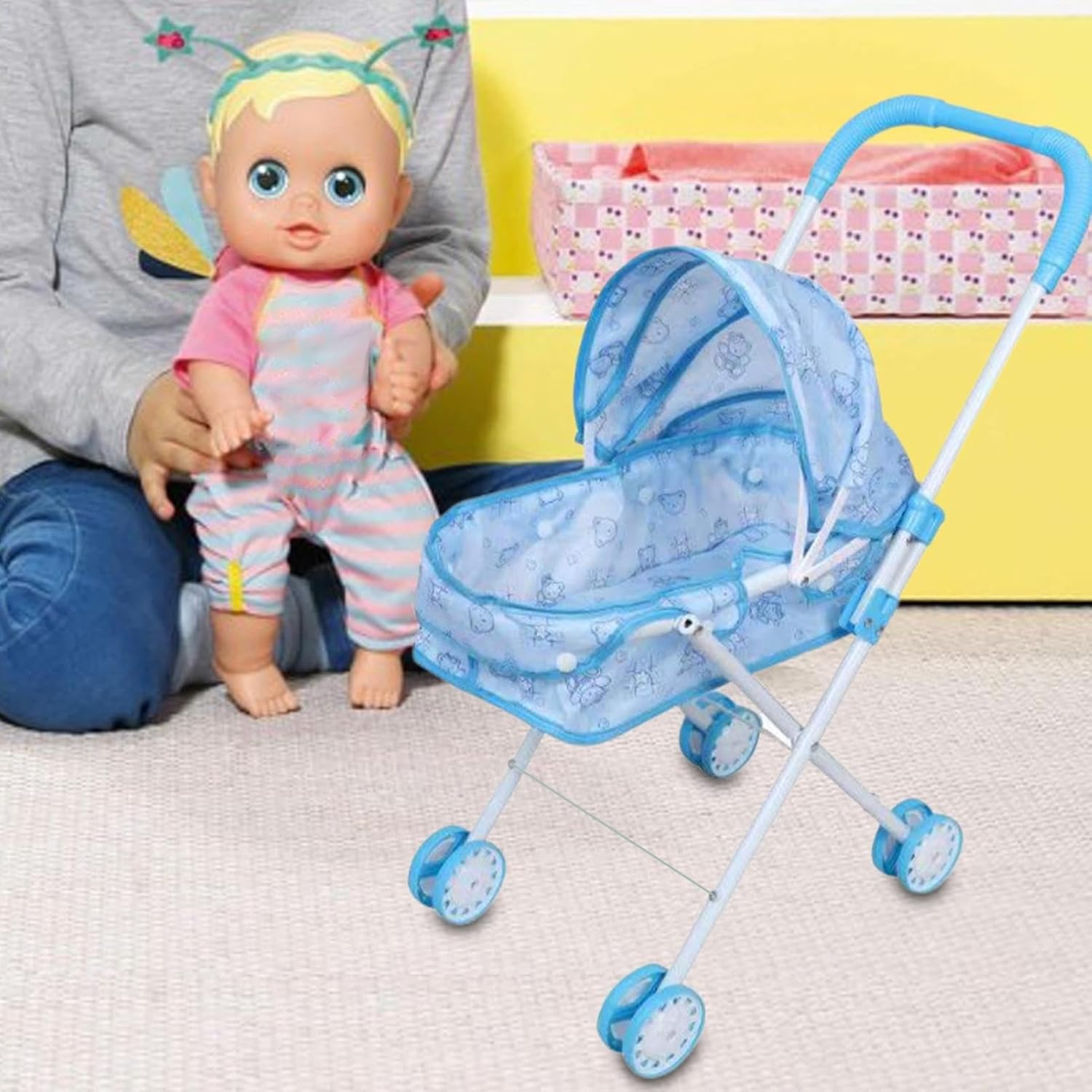 The Kids Play Stroller with Canopy is an ideal carriage for both boys and girls who want to explore imaginative play at home or during outdoor activities. Designed to inspire creativity, this stroller serves as the perfect companion for travel, birthday, and school events. Its versatile design encourages role play, making it suitable for both indoor and outdoor use. Parents value their ability to keep children entertained while developing social and developmental skills. The included canopy adds and realism, enhancing the symbolic play experience. Whether for gifting or for personal use, this stroller ensures lasting fun for young minds eager to mimic real-life scenarios. Specification: Styles: Bear, Pink Strawberry, English Pink, Strawberry Pink Product size: about 24x44x55cm/9.45x17.32x21.65inch Packing size: about 25x54cm/9.84x21.26inch Material: PP+metal+fabric Product List: 1 * Doll Stroller Notes: Due to different lighting and screen settings, the item's color may be slightly different from the picture. Due to the difference in manual measurement, please allow 1-3 cm difference.