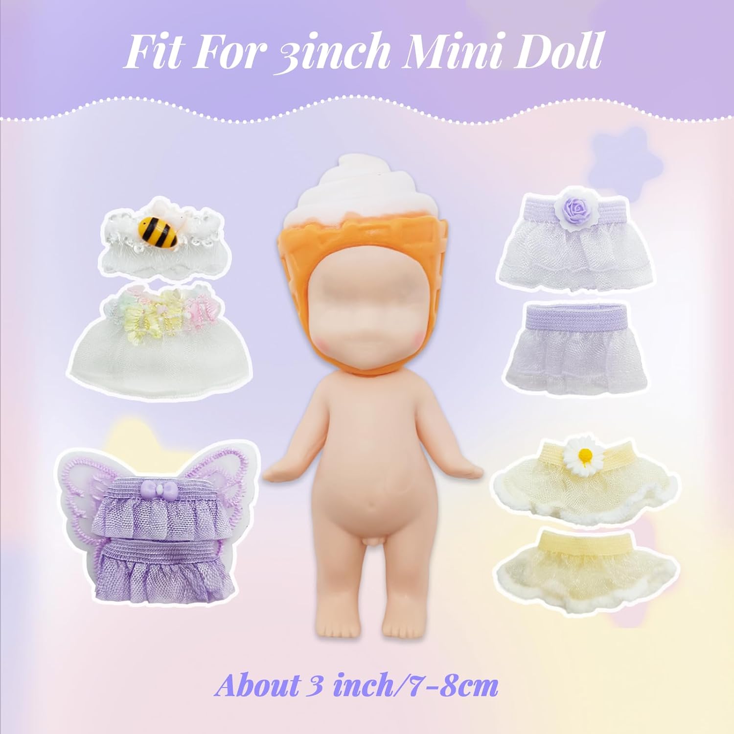 Features 1. The doll accessories comprise four outfits and four beaded necklaces, featuring a fresh purple and yellow colour scheme. Designed specifically for 3-inch (approx. 7.5-8cm) collectible dolls, these outfits instantly lend the dolls an exquisite and spirited charm, enhancing the appeal of your collection. Please note: the set does not include the figurine itself. For safety reasons, it is not suitable for children and is recommended for adult collectors aged 14 and above. 2. Tailored to the doll's form, the outfit features a snug, secure fit achieved through hand-sewn craftsmanship with exquisite detailing. The ensemble combines stretchy lace with a flowing tulle skirt, complemented by accessories including bee motifs, satin flowers, and a butterfly-wing cape. This creates rich visual layers while evoking a soft, fairy-tale atmosphere, resulting in a dreamy, high-end aesthetic. Additionally, the garments utilise stretchy fabrics for effortless dressing without snaps or adhesives. The beaded necklaces are lightweight yet secure, preventing scratches or damage to the doll's surface. This facilitates easy styling changes for seasonal themes, story scenes, or TikTok/Instagram displays, significantly enhancing playability and presentation appeal. 3. This set not only includes four outfits but also comes with four additional beaded necklaces, satisfying collectors' demand for high-quality accessories. Whether as a birthday gift, a collector's exchange present, or an everyday surprise, it is an ideal choice for enthusiasts, particularly those pursuing exquisite, photogenic doll attire. It is an essential item for elevating the quality of any collection. Packaging 4 clothes + 4 pearl necklaces Specifications Material: Polyester Suitable for: 3-inch (approx. 7.5-8cm) collectible dolls Colour: Purple + Yellow Please note the following: 1. Due to manual measurement, there may be a 1–2 mm deviation. Please check the length before ordering. Thank you for your understanding. 2. We love our customers and do our best to satisfy each and every one of them. If you have any questions, please contact us.