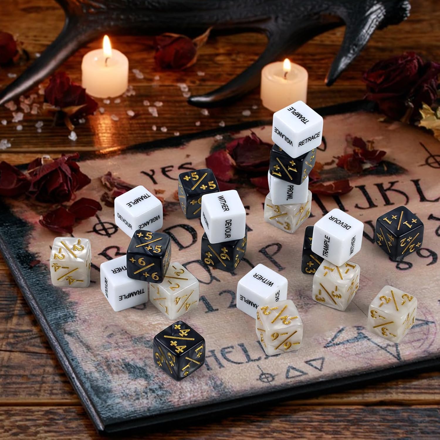 Features:- Material: acrylic- Contains: 24 MTG keywords dice+24 pcs dice token+1 velvet pouch- Ability Keywords(1):TRAMPLE,VIGILANCE,PROWL,WITHER,RETRACE,DEVOUR- Ability Keywords(2): REBOUND,INFECT,POISONOUS,REINFORCE,UNEARTH,LEVEL UP- Compatible Game: Perfect compatible with MTG - Magic The Gathering, some TCG and card games.Warm tips:-Small part, please keep them away from children under 3 years old. Adult supervision is required.