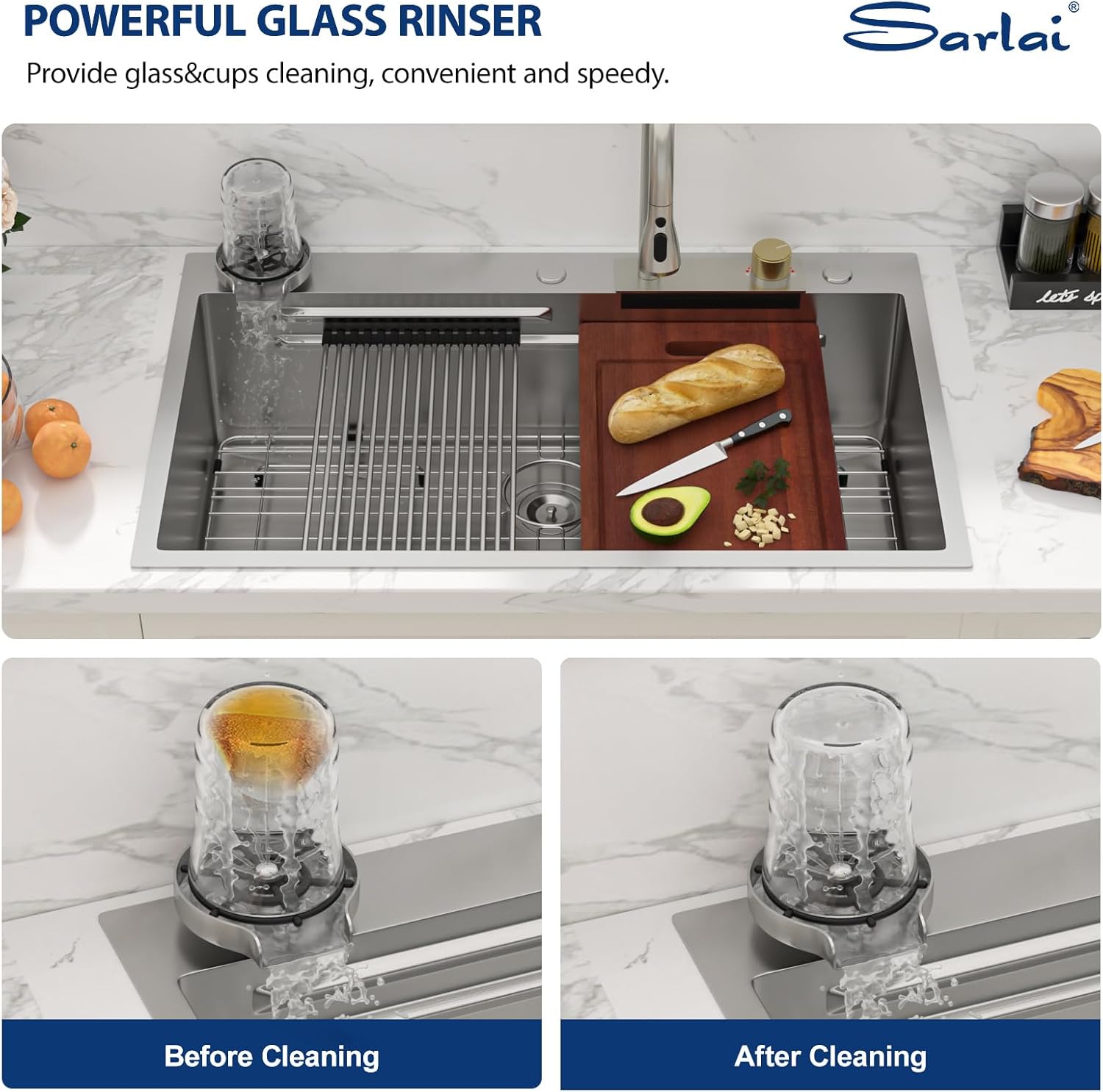 | Included Components | colander, cup rinser+faucet, cutting board, drain assembly, roll up drying rack+bottom grid |