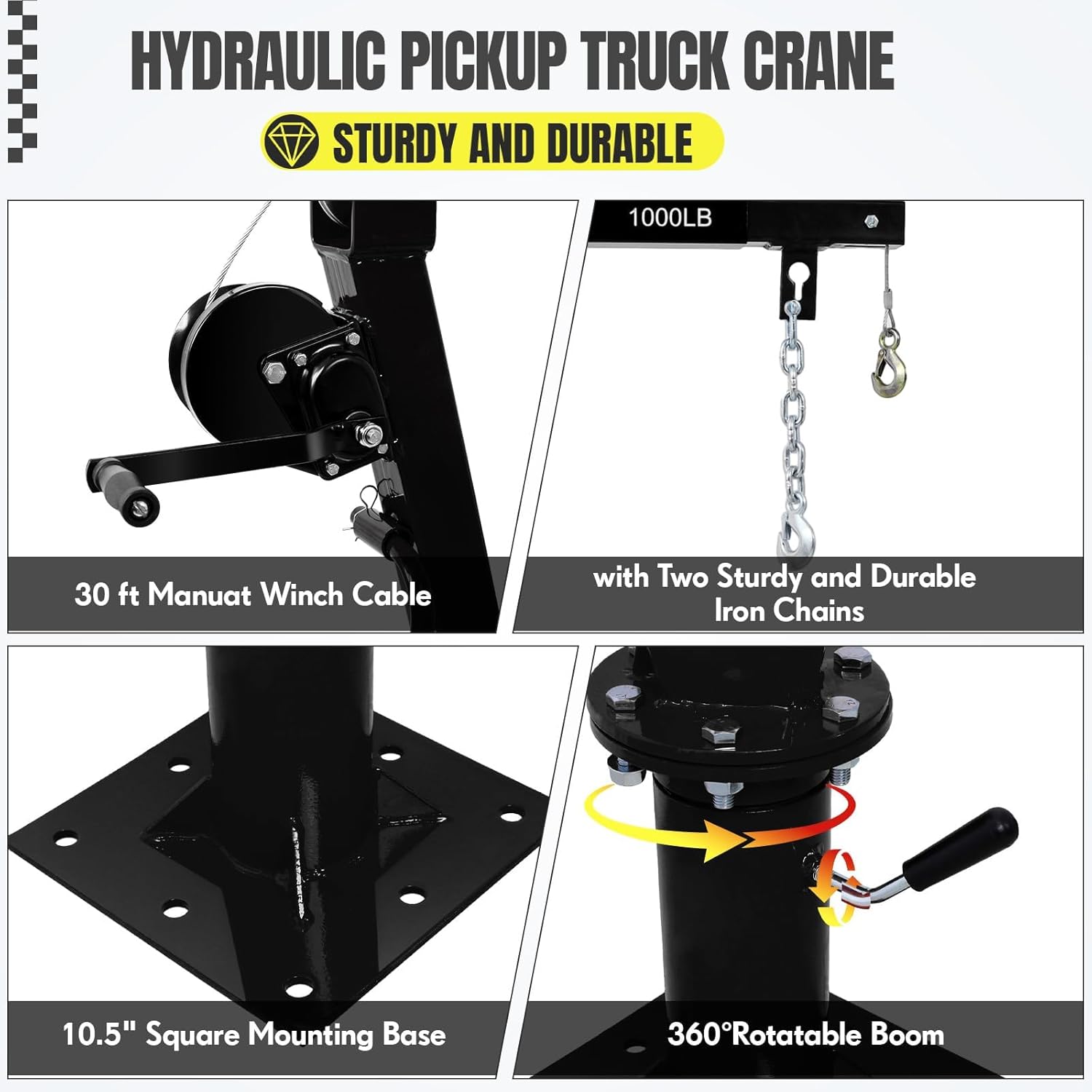 Effortless Heavy Lifting for Professional ApplicationsImpressive 2000 lbs Capacity: Engineered for demanding jobs, this hydraulic pickup truck crane easily lifts and transports heavy loads up to 2000 lbs, making it ideal for construction sites, factories, and warehouses.Robust Steel Construction: Built from high-strength steel, the crane is designed for durability and long-lasting performance under tough working conditions.360° Swivel Boom: The fully rotating jib allows for Accurate positioning and effortless loading or unloading from any angle, maximizing efficiency in tight spaces.Space-Saving Collapsible Design: Features a convenient folding mechanism that enables easy storage and portability, transforming your truck bed into a versatile lifting station without sacrificing space.Manual Hand Winch Included: The integrated hand winch provides smooth, controlled lifting and lowering for a variety of materials and equipment, ensuring safe and reliable operation.This truck-mounted bed crane is the professional solution for anyone needing to handle gypsum boards, machinery, tools, or other bulky items. Perfect for industrial and research environments where material handling efficiency is critical. Upgrade your work truck with this Basic lifting device and experience unmatched convenience and productivity on every job.