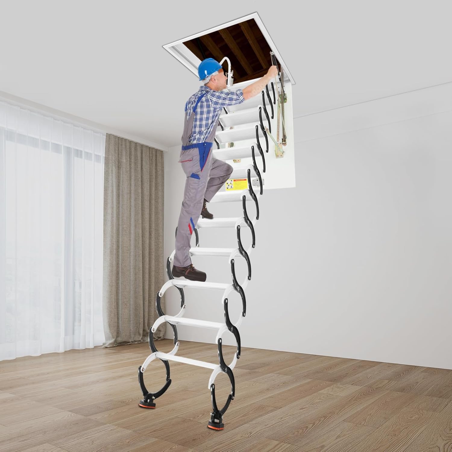 DescriptionOur folding attic ladder is the ideal choice for convenient access to your attic. It can solve the problem of going up and down the ladder in limited spaces. The high-class materials and optimized structure provide high load-bearing capacity, ensuring stability during use. The retractable design allows the ladder to fold when not in use, saving floor space. We believe it will provide you with an excellent experience of going up and down the ladder.Key FeaturesUser Friendly: It adopts a special S-shaped bracket design, which is not only convenient for folding and pulling down, but also improves its load-bearing capacity. Moreover, you can adjust the tilt angle (60°, 65°, 70°) of the ladder through the holes in the bracket arms to accommodate different usage spaces. The optimized springs and mechanical structure ensure that the ladder is smooth and stable during expansion and contraction, providing a convenient way of passage.Modern Appearance: The classic color and smooth lines make it simple and fashionable, which can be well integrated into various interior decoration styles.Easy to Clean: Its smooth surface and simple structure make daily cleaning and maintenance easy for you.Protective Package: To prevent the product from being damaged and bumped during transportation, we packed it with bubble bags, pearl cottons and cartons to protect your products to the maximum extent possible.DetailsPull Ring and Rod: They make it easy for you to manually extend and retract the ladder. Rubber Pads: They not only provide an anti-slip function but also protect your floor from damage.Rounded Edges: They are designed to protect your delicate skin from scratches during use and installation.ApplicationIt is suitable for flat roofs, attics, garages, rooftops, basements, warehouses, shops, etc., providing convenient access in areas with limited space.SpecificationsColor: Black, WhiteMaterial: Cold-rolled Steel, Steel, Solid Wood, Galvanized, RubberTreatment: Spray MoldingMounting Type: Hidden Ceiling MountInstallation Required: YesAmount of Steps: 12 Weight Capacity: 300kg/661 lbsAdjustable Tilt Angle: 60°, 65°, 70°Each Round Frame Size: 28*25.5cm/11.02*10.04inOverall Step Length: 44cm/17.32inSuitable Vertical Height: 2.9-3.1m/9.51-10.17ftEach Step Size(L*W): 40*14cm/15.75*5.51inFrame Size(L*W): 100*70cm/39.37*27.56inPackage Size: 110*80*48cm/43.31*31.5*18.9inGross Weight: 61kg/134.48 lbsNet Weight: 57.95kg/127.76 lbsPackage Included1* Folding Attic Ladder1* Pull RodOther Accessories for AssemblyNotes1.Please clearly confirm the size of the product before you purchase it.2.Please note that the installation opening must be neat and flat, and the four sides of the opening should not be against the wall. Each side should be at least 1.97 inches away from the wall.3.Please note that the ladder cannot be opened from above. Therefore, after the ladder is installed and retracted, please do not step on it from above.4.Please try to use the ladder one person at a time, and use it within its weight limit.5.Please allow the slight color difference caused by the shooting light and 1-3cm error due to manual measurement, and make sure you do not mind before you order.