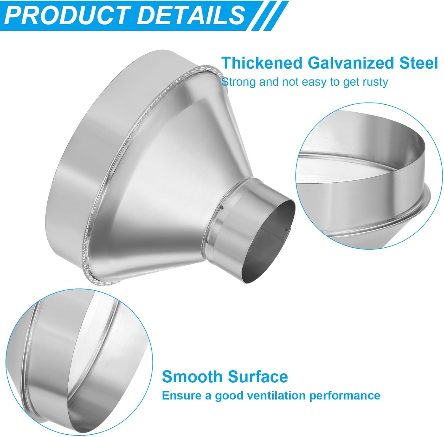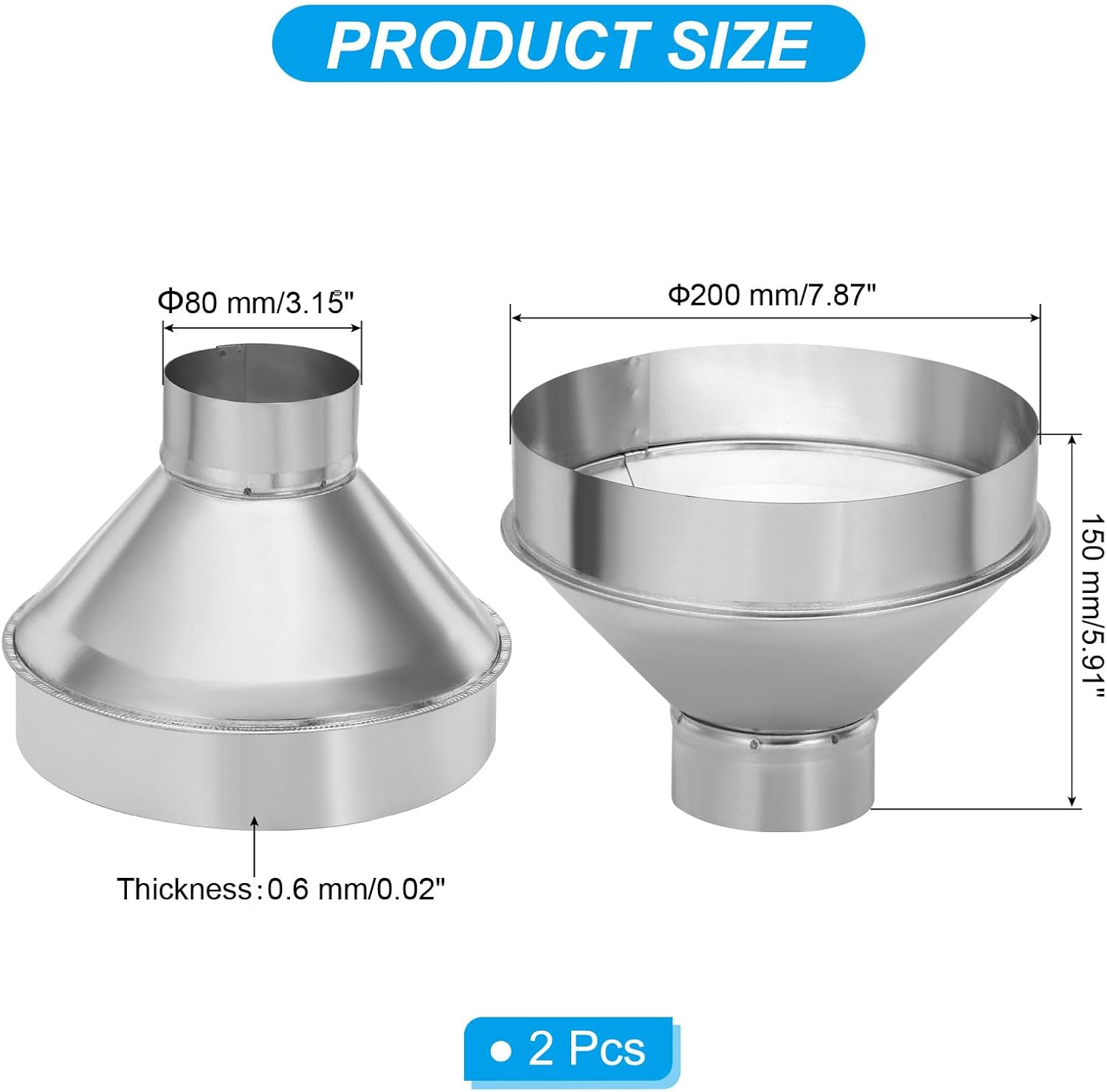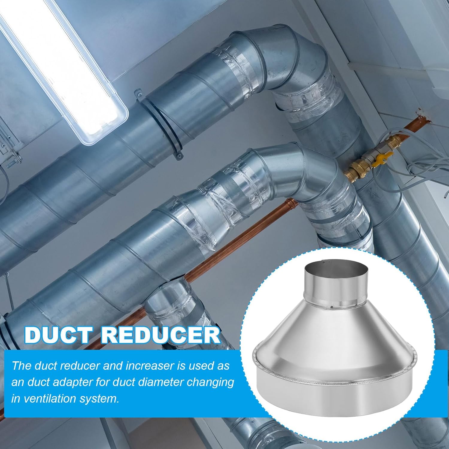 The duct reducer and increaser are used as a duct adapter for duct diameter changes in the ventilation system. Suitable for the HVAC system, bathroom exhaust, air-cooled hood, embedded fans, hood, roller dryer, dust collection system, etc.SpecificationMaterial: Galvanized SteelColor: Silver ToneBiggest Outer Dia.: 200 mm/7.87 InchSmallest Outer Dia: 80 mm/3.15 InchTotal Size: 150 x 0.6 mm/5.91 x 0.02 Inch(L*T)Package List: 2 Pcs x Duct ReducerAdvantageThe duct adapter is made of thickened galvanized steel material, which is strong and not easy to get rusty, and the surface is smooth enough to ensure a good ventilation performance.InstructionEasy to install, just connect the duct reducer to a metal air duct or vent hose, and use pipe clamps to fasten the connection.NoticePlease check the size carefully before purchasing.