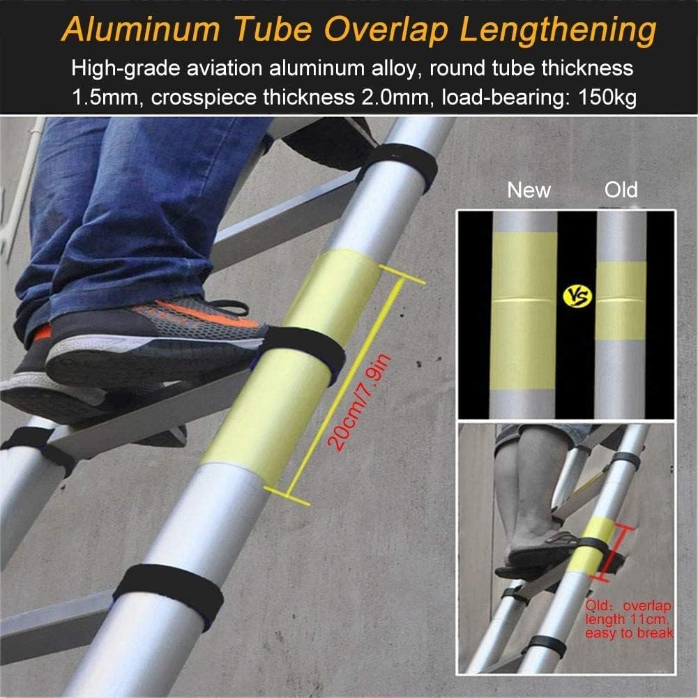 Product Description: Lightweight Durable Extendable Ladder is Designed with Safety in Mind. Not SafeAbsolutely not! The non-slip foot pad ensure your safety during use. Our ladder has wider texture steps than the comparable multi-use ladders. Poor QualityOf course not! The aircraft grade aluminum and high strength engineering plastics design strengthen the stability of the ladder. Features: Made of aluminium alloy, stable and durable. Portable and convenient for storing. The aluminum tubes overlap and lengthen, the lengther the overlap, the stronger. Whether you are a professional contractor or just ticking off the chores at home, telescopic Extension Ladder is your good partner. Package Included: 1 x Telescoping Ladder Tips: Do not put your hands or fingers between the rungs while retracting to avoid pinching. One-Make sure that the safety catch on both sides of each step are locked firmly before you can climb the ladder. The use of different heights must be fully opened on the top, and kept in the contracted state below (It cannot be used if the middle part is opened or closed or cannot be pulled in place) Light photography and different display may cause the color of the objects in the photo to be different from the real ones. We are very confident that you will love our telescoping Ladder, if you do not like it, we will refund for you !