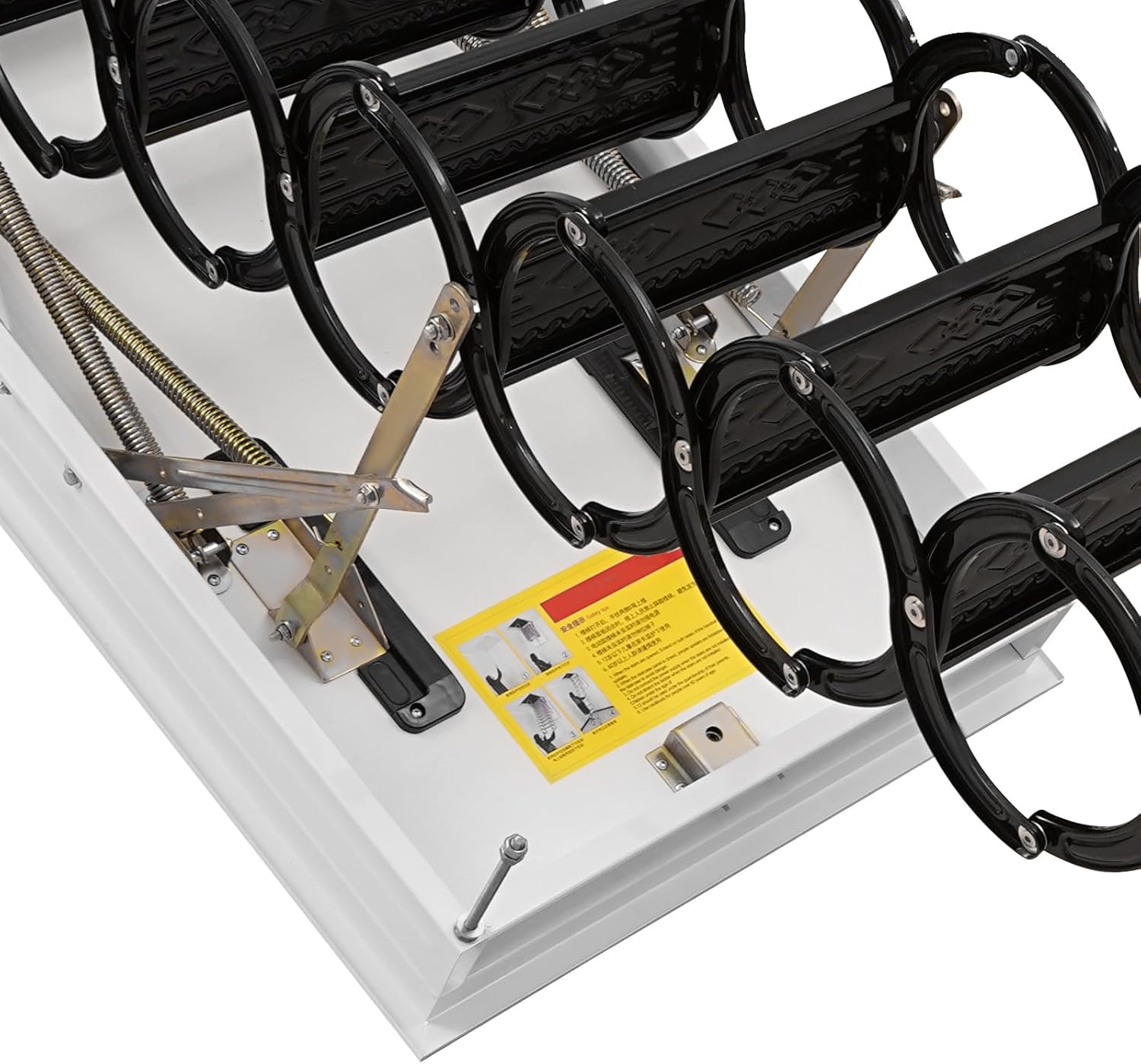 SpecificationMaterial: Cold Rolled Steel, Rubber, PVC, Stainless Steel, High Manganese, Wood, Paint-free Fireproof BoardsProcess: Stamping, PVC WrappingColor: Black, WhiteNumber of Steps: 12Type: Ceiling MountLoad-bearing Capacity: 300kg/661.39 lbsInstallation Vertical Height: Less Than 3.5m/11.48 ftTotal Ladder Width: 44cm/17.32inStep Size: 40*14cm/15.75*5.51inHeight Between Steps: 28cm/11.02inApplicable Opening: 100*70cm/39.37*27.56 inDistance Between Opening Edge and Walls: More Than 5cm/1.97inRequired Opening Bottom Operating Space: More Than 1.6m/5.25ftCeiling Thickness: 13-25cm/5.12-9.84inPackage Size: 110*80*48cm/43.3*31.5*18.9inGross Weight: 61kg/134.48 lbsNet Weight: 58kg/127.86 lbsPackage Included1* Pull Down Attic Stair1* Pull Rod1* Toolbox1* Chinese and English Instruction1* Chinese Installation DiagramAll Accessories for UseNotes1. Please check the style and size before purchasing.2. It only fits for ceiling installation.3. It is recommended that the screws be inspected regularly and tightened as needed to ensure continued safety and longevity.4. It is recommended that it be used by one person at a time and not exceed the maximum load capacity (661.39 lbs). Please watch out when you install this product and do not stand under the opening during installation.5. The recommended ceiling thickness is 5.12-9.84in because a thin ceiling is easy to card and is not tight. The ceiling material is suggested to be channel steel, thick square tube, cast-in-place board, thick wooden board, and other bearing structures.