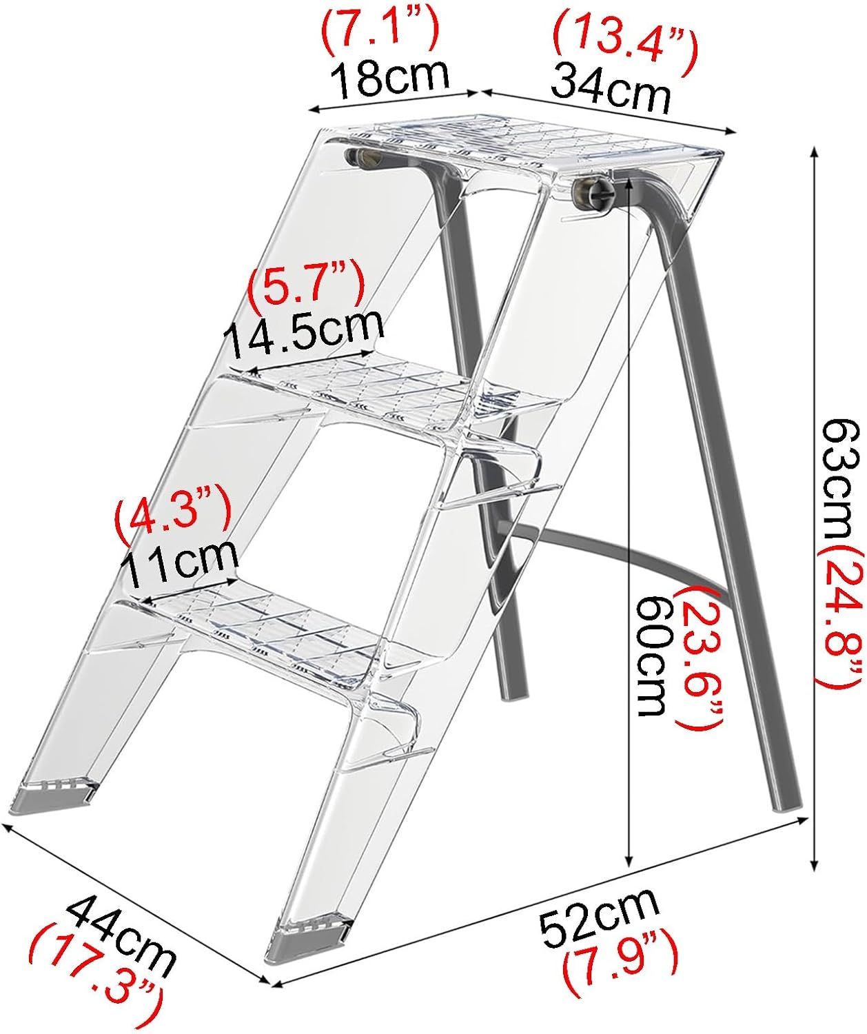 Reinforced locking slots ensure flexible structure and smooth folding for effortless opening/closingElectroplated steel legs made from premium steel offer high strength and durabilityThickened silicone non-slip pads and reinforced feet provide dual non-slip protectionSpace-saving design: Easily folds to compact dimensions for clutter-free storageFolds for flexible, space-efficient storageFits in cabinets, corners, or narrow gapsEffortlessly adapts to any indoor spaceProduct Name: Multifunctional Home Folding Step StoolPrimary Material: PC + Electroplated Steel TubingProduct Color: TransparentApplications: Ladder, Storage Rack, Plant Stand, Bookshelf, Shoe RackProduct Listing: Step Stool x1 (excludes other accessories)Important Notes:- Slight variations may occur due to manual measurement- Color differences may appear due to variations in photography equipment, angles, and lighting conditions- The folding step stool is manufactured using injection molding. Some units may exhibit silver-line scratches or flow marks. These are not cracks but production-related traces that cannot be entirely avoided and do not affect product functionality.