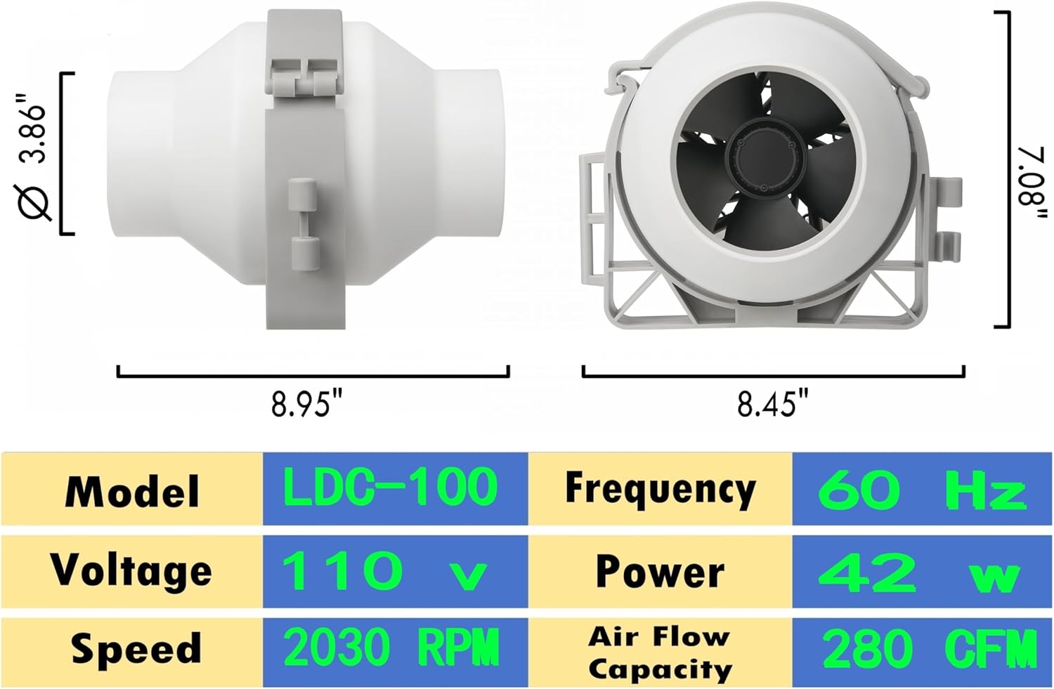 The Gainsh 4 Inch Inline Duct Fan is a high-performance ventilation solution designed to boost airflow in various indoor spaces. With a robust 280 CFM mixed-flow design, it efficiently circulates air, removing excess moisture, unwanted odors, and heat to create a healthier, more comfortable environment. This inline blower fan features a built-in speed controller, letting you easily adjust airflow from gentle circulation to powerful exhaust, perfect for customizing ventilation in bathrooms, kitchens, grow tents, and HVAC systems. Its quiet operation ensures minimal noise disruption, while the durable plastic housing and mounting base provide stability and long-term reliability. Compatible with standard 4-inch ducting and featuring a plug-and-play design, this fan is simple to install and operate. Whether you’re improving bathroom ventilation, enhancing kitchen air quality, or supporting a grow tent setup, the Gainsh inline duct fan is a versatile and efficient choice for all your ventilation needs.