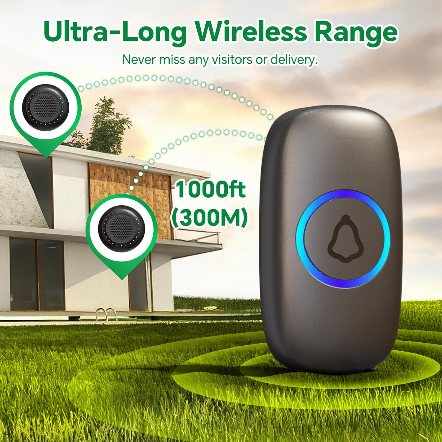 1000ft Wireless Range for Homes/Classrooms/Offices - With a 1000ft wireless range(in open area), this wireless doorbell is perfect for home, classroom, office. Whether you’re in the living room, bedroom, basement, you’ll never miss a visitor IP55 Waterproof for All Weather Durability - Designed with IP55 waterproof rating, this doorbell works in any weather. Whether it’s rain, snow, or extreme heat, this durable device ensures reliable performance outdoors. Perfect for outdoor use and business premises 48 Chimes & 5 Volume Levels for Personalized Alerts - Choose from 48 melodies and adjust the volume with 5 levels(Include Mute Mode) to suit your preferences. Perfect for families, elderly users, and business owners who need flexible sound options for different environments Quick & Easy Installation Without Wiring - No wiring required! Just plug in the doorbell receiver and mount the doorbell button(Battery Include & Easy to Press) using adhesive or screws for instant use. This classroom doorbell offers a quick, hassle-free solution for homeowners, renters, and business owners We Care About Your Experience - This door bell is FCC, CE, and RoHS certified for peace of mind, plus an 12-month warranty. Any questions during use? Don’t hesitate to contact us!