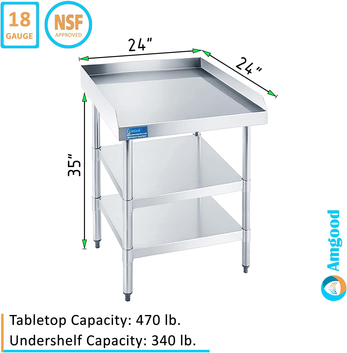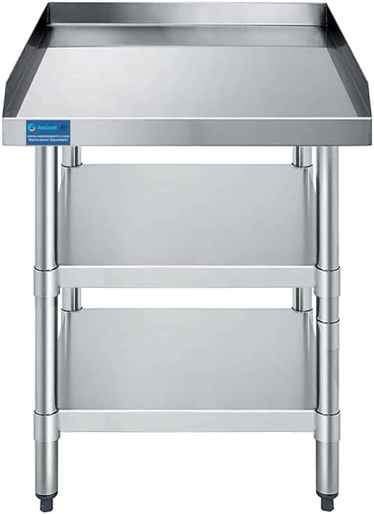 Stainless Steel Work Table With Galvanized Two Under Shelf Common Applications: Food Prep Table For Commercial Kitchen Kitchen Island Counter Extension Utility Bench for Shop Professional Work Station Garage Work Bench Laundry Clothes Folding Table Brewing Setup Exam Table For Veterinarians Butcher Shop Product Specifications Stainless steel worktable surface has curved edges for safety and comfort. It incorporates a heavy duty adjustable galvanized two under shelf and leveling feet. 18 Gauge 430 Stainless Steel Top Galvanized Adjustable two Under Shelf Adjustable feet to compensate for uneven floor Adjustable two under shelf - great for storage Height: 35" NSF Certified Sturdy & easy to setup Heavy Duty AmGood Supply prides itself of being a one stop shop for all of your restaurant supply needs. AmGood Supply offers a wide selection of stainless steel work tables with galvanized legs and two undershelf. All work tables are made with T-430 18 gauge stainless steel, designed to be easily assembled, and are NSF certified. Stainless steel work tables are commonly used for food prep in a commercial kitchen, as a work desk, assembly line table, work bench, and in many other residential, commercial and industrial applications. AmGood Supply work tables are known for their premium quality and economy prices. Frequently Asked Questions What is the height of the table? The height is 35" Is it hard to assemble? The work table is designed to be assembled by one person. Assembly should take 10-15 min. Is hardware included? Yes, a set of screws and an Allen wrench are included in the order.