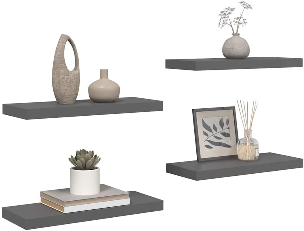 This set of 4 floating wall shelves is the ideal solution for enhancing your living spaces while providing functional storage. Crafted from high-quality MDF with a sleek high gloss grey finish, these shelves fit beautifully into any decor scheme, adding a classy touch to your living room, bedroom, or office. They offer a perfect combo of style and practicality, letting you display books, ornaments, or collectibles without showing any clutter.Seamless Design: The high gloss grey finish looks amazing, making your displayed items pop. The floating design keeps things tidy and adds a classy touch.Durable Material: Made from engineered MDF, these shelves stand up to wear while keeping their stylish look. The glossy finish not only makes them last longer but also makes cleaning super easy.Versatile Use: Ideal for any setting, these shelves can hold books, decorative pieces, or personal keepsakes. Their sleek size fits easily into any room, adding both style and function.Easy Installation: Each shelf comes with simple instructions and all the hardware needed for a quick setup. You’ll have your shelves up and showing off your favorite items in no time.Weight Capacity: Each shelf can hold up to 15.4 lbs, giving you plenty of strength for your decorative needs while keeping everything secure.Number Of Items: 4Color: GreyShape: RectangularMaterial: Wood MDFFinish: High-GlossIndoor/Outdoor: Indoor OnlyCover Included: NoRoom: Living RoomMaximum Weit: 15.4 lbsMounting Included: YesDimensions: 9.3 x 23.6 x 1.5 in (W x L x H)Surface Height: 1.5 inWeight: 12.74 lbsLadder: NoDelivery Contains: 4 x Wall shelfAssembly Required: YesRecommended Number of People for Assembly: 1