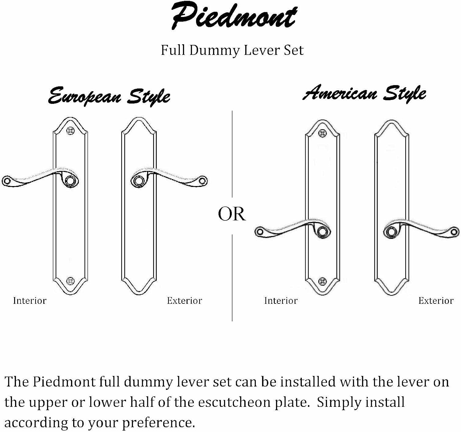 Piedmont by FPL- Solid Brass Full Dummy Lever SetCrafted in the tradition of fine European door hardware, the Piedmont solid brass lever set features slender escutcheon plates in an appealing, classic design. The ornate detailing and stately profile of the rope levers appeals to traditional styling and clearly convey the high quality of this lever set. Solid brass construction and secure through-door mounting insure durability and long-lasting operation. Many beautiful finishes, including unique distressed finishes, are available to satisfy even the most discriminating tastes. Experience the difference high-quality door hardware can bring to your home!Technical Details:This full dummy lever set is for use on the inactive door on a set of double doors and mirrors the active Piedmont entry lever set. Non-operational dummy set only includes back plates and levers with mounting hardware. No latch is included. Escutcheon plates are 1-3/4” W x 9-1/8” L and will not cover standard 2-1/8” cross-bore holes (Please search for the following styles to see wide escutcheon plate options- Diplomat, Envoy, Lavish, Luxuriant, and Royal). Lever set can be installed with the levers on the upper or lower half of the escutcheon plate (see handing placement photo). Please also see lever set dimension and milling detail photos to ensure fitment. Installation hardware fits standard 1-3/4” thick exterior doors. Hardware kit for 1-3/8” thick interior doors is available, please contact Customer Service. Matching entry, privacy, and passage sets are available enabling you to use this hardware style throughout your home. Search for: FPL + Piedmont + function, for example “FPL Piedmont entry”.